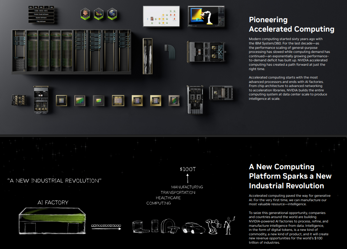 게임 산업 내 그래픽카드(GPU)로 시작하여 데이터 센터, 자율 주행, 메타버스 등 미래 기술의 핵심적인 역할을 수행하며 'AI 시대의 엔진'으로 불리고 있습니다.
