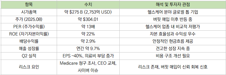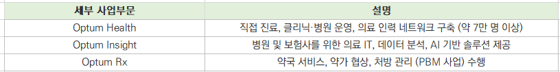 - 핵심 사업: ‘UnitedHealthcare’ (보험) + ‘Optum’ (의료 IT, 데이터, 처방 시스템 등)