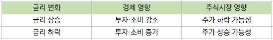 - 기업 : 돈을 빌리는 비용(이자)이 늘어나게되면 투자 축소를 축소하게되고 이로 인한 이익 감소