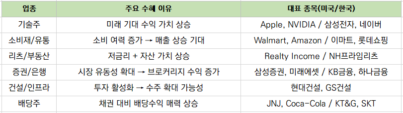 위 표에서 정리한 수혜 섹터는 금리 인하 시 자금 유입 가능성이 높은 산업군이죠.