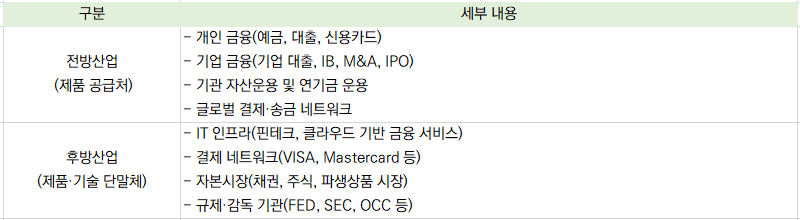 → JP모건의 금융상품·서비스를 직접 활용하는 수요처 - 후방 산업: 핀테크, IT 인프라, 결제망, 금융 규제기관