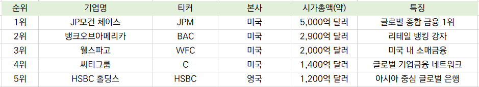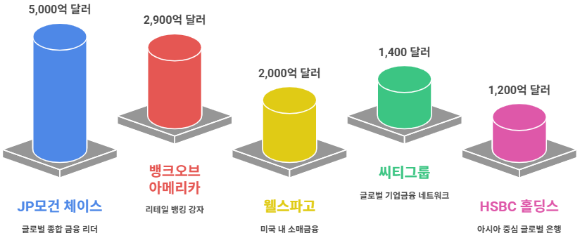 JP모건은 자산 규모, 시가총액, 글로벌 금융 네트워크에서 업계 1위를 차지하며,