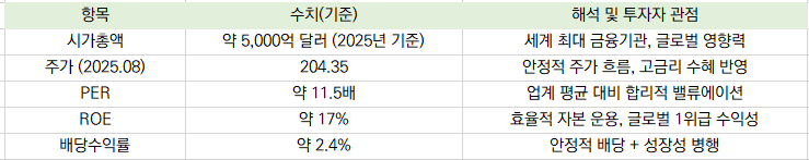 - 디지털 금융 선도: 블록체인 결제망(Onyx), AI 기반 리스크 관리 등 혁신적 금융기술 적용