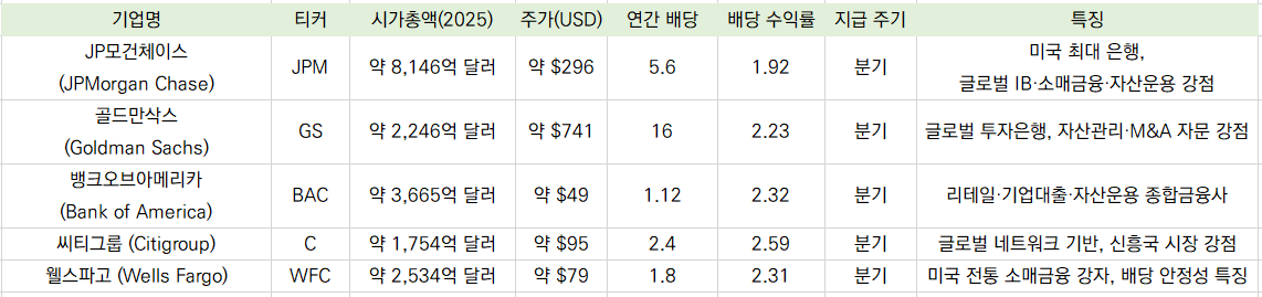 특히, JP모건, 골드만삭스, 뱅크오브아메리카, 씨티그룹, 웰스파고 등은 글로벌 금융시장에서 안정성과 배당 매력을 동시에 제공하는 대표 기업들로 꼽힙니다.