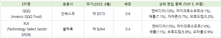 특히 QQQ와 XLK는 미국 IT 대형주 비중이 높아 투자자 선호도가 큽니다.