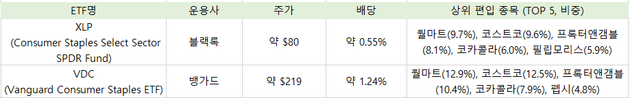 개별 종목 대신 분산투자를 원한다면 ETF를 활용하는 것이 효과적인데, 필수소비재주를 대표하는 ETF로는 XLP, VDC로 구분할 수 있습니다.