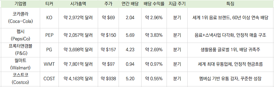 대표적으로 코카콜라, 펩시, 프록터앤갬블, 월마트, 코스트코 등 안정성과 배당의 이점을 동시에 제공하는 대표적인 기업이라 할 수 있어요.