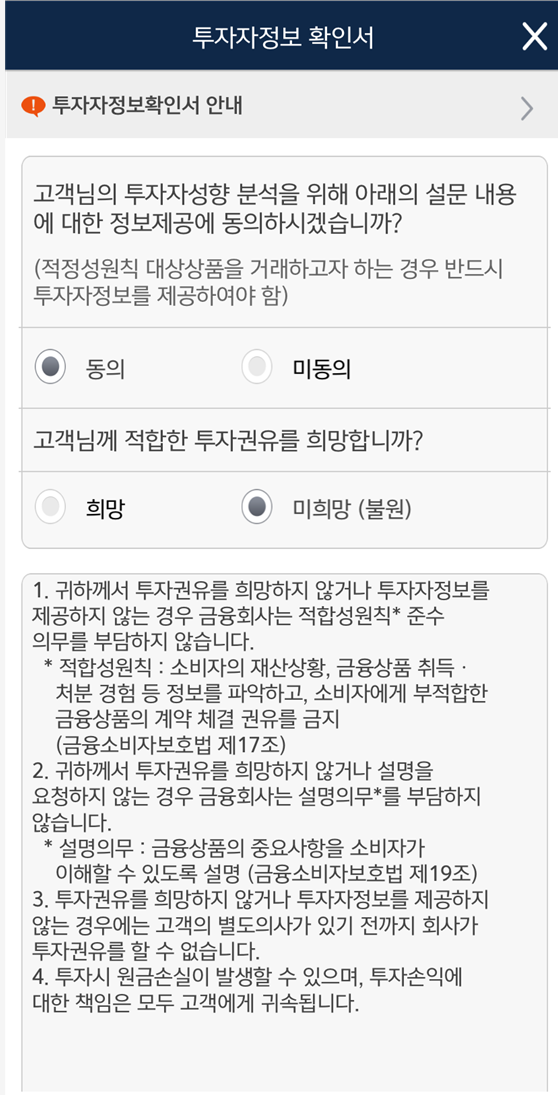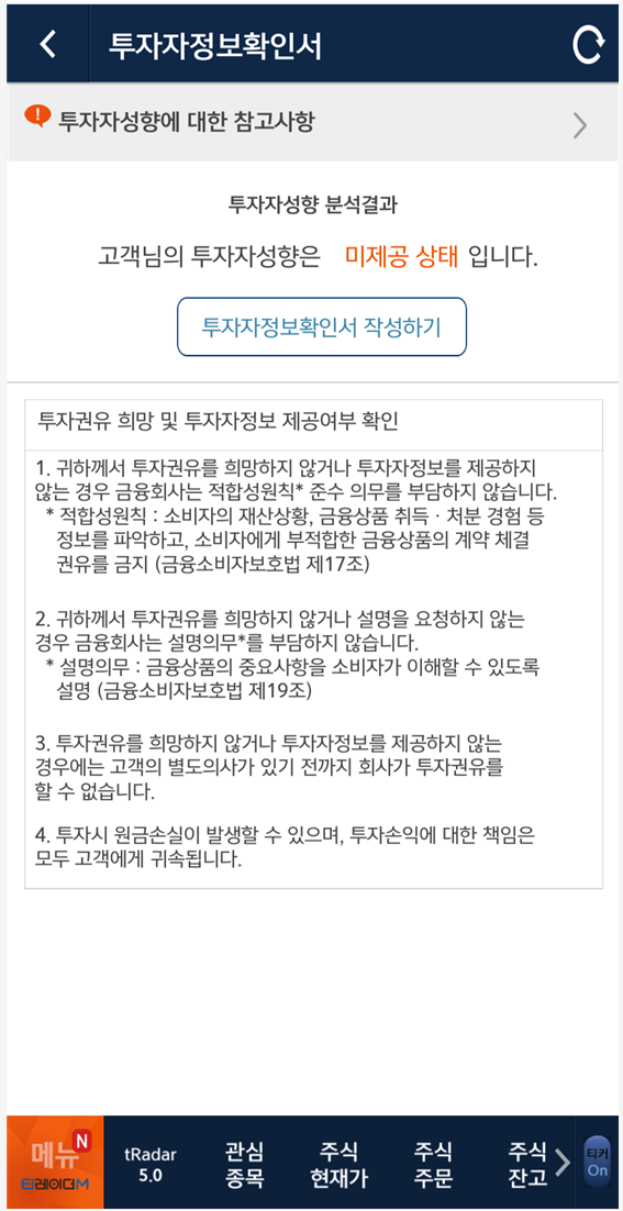 " 투자성향이 없는 경우 주문이 불가합니다"라는 알림이 뜨더라도