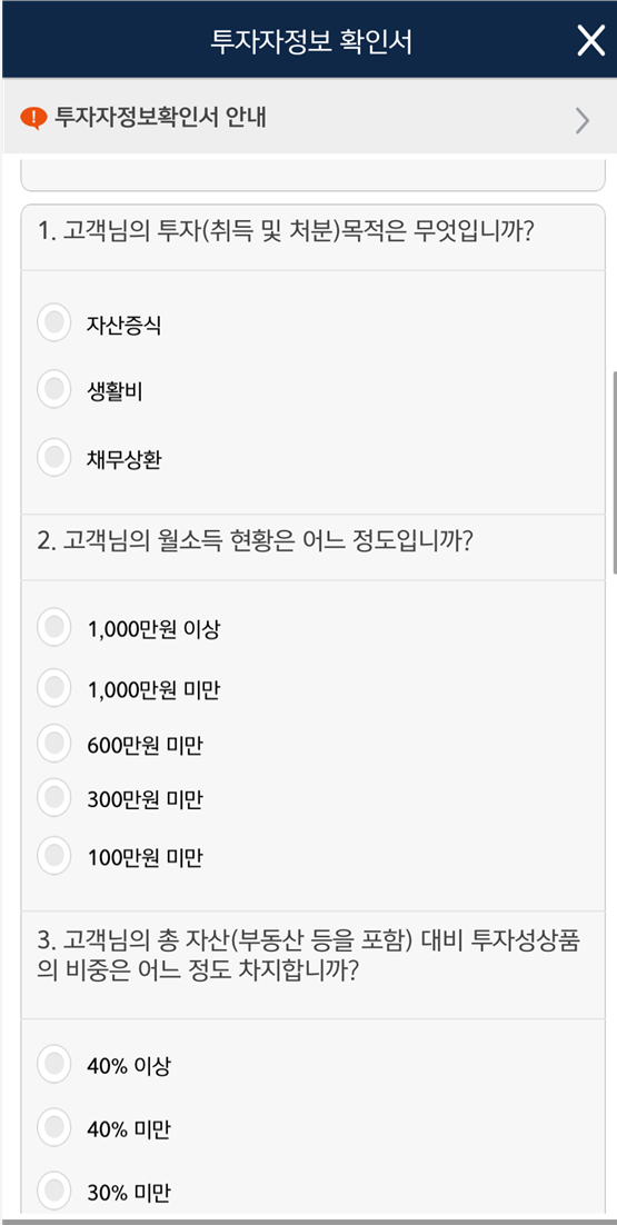 그 뒤로 투자목적, 월소득현황, 총자산, 투자상품 등등 질문이 있는데,