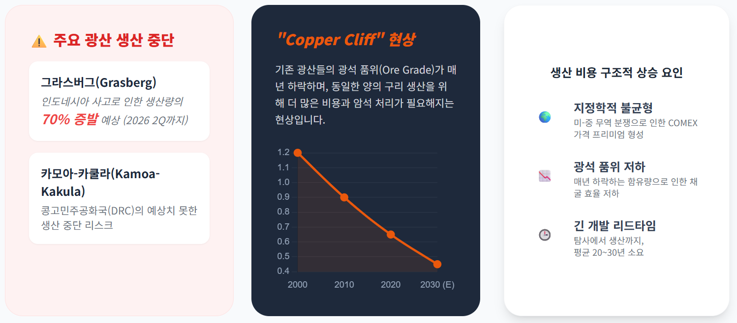 새로운 구리 광산을 개발하여 생산을 시작하기까지는 평균 20년에서 30년이 소요되며, 기존 광산들의 광석 품위(Ore Grade)가 매년 하락하고 있다는 점도 심각한 문제입니다.