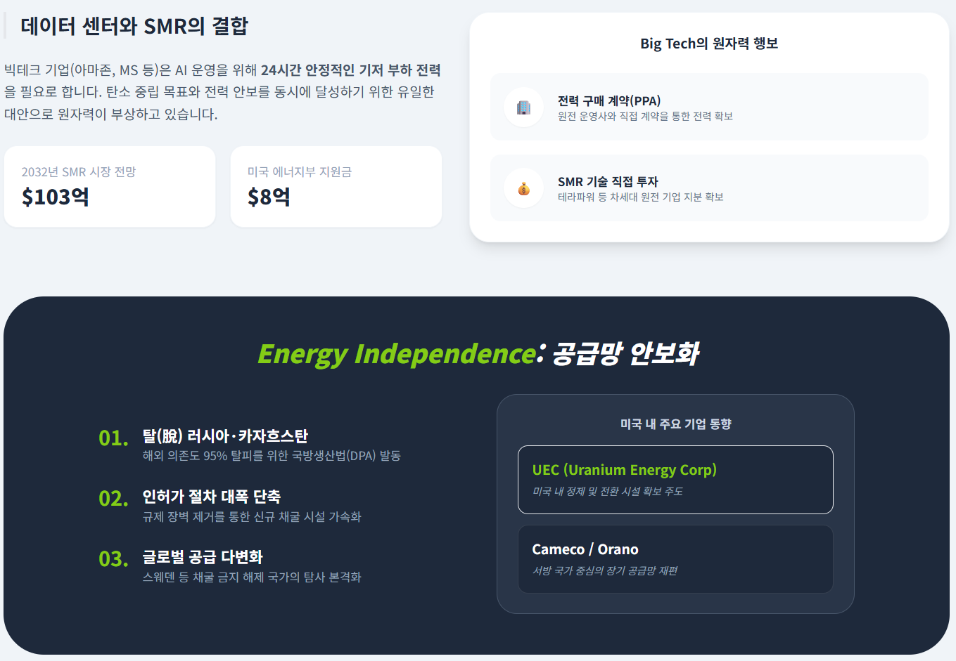 빅테크(아마존, 구글, 마이크로소프트)가 직접 원전 계약에 나서면서 우라늄은 '에너지 안보'의 핵심 자산이 되었습니다.