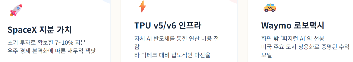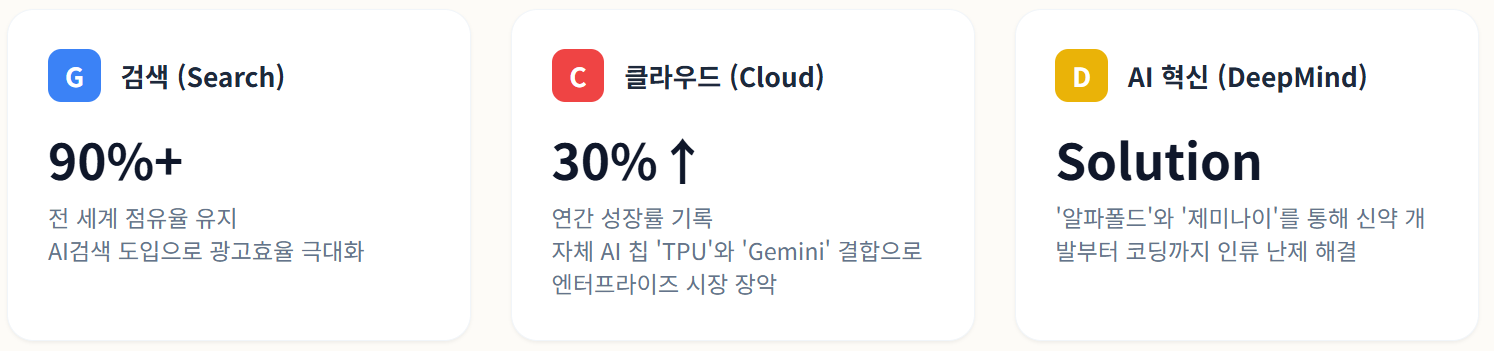 - 클라우드(Google Cloud): 자체 AI 칩 'TPU'와 'Gemini'를 결합해 연 30% 이상의 고성장 기록