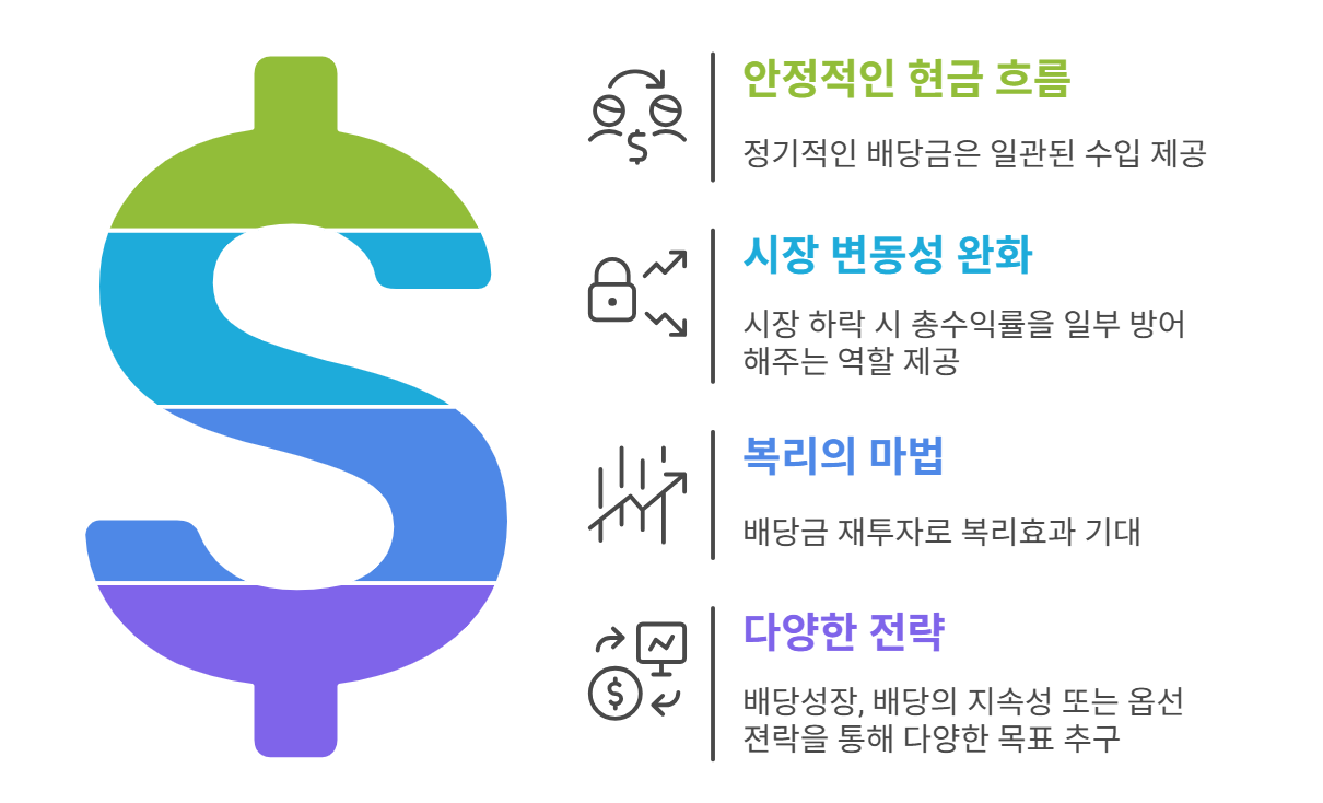 - 시장 변동성 완화: 배당금은 시장 하락 시 투자자의 총수익률을 일부 방어해 주는 역할을 함