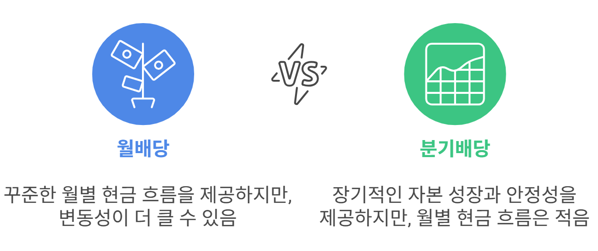 - 단점: 월별 현금 흐름이 필요한 경우, 분기별 배당은 적을 수 있음