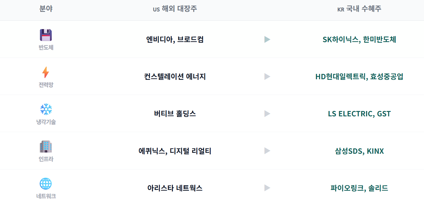 | 주요 산업 | 전력기기·액침냉각·반도체 | 변압기·HBM 메모리 | 미국 데이터센터 리츠 |