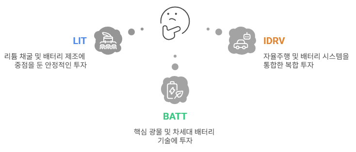 LIT는 전 세계 배터리 점유율 1, 2위인 CATL과 BYD를 포함하여 글로벌 배터리 표준에 투자합니다. 반면, BATT는 리튬, 코발트 등 원자재 광산 기업 비중이 높아 리튬 가격 반등 시 가장 빠른 수익률 회복을 보여줍니다.