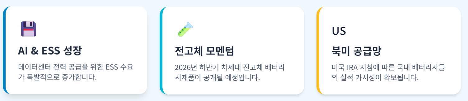 - 신성장 동력 확보: 전기차 캐즘을 돌파할 ESS시장의 폭발적 성장과 2026년 하반기 전고체 배터리시제품모멘텀을 선점합니다.