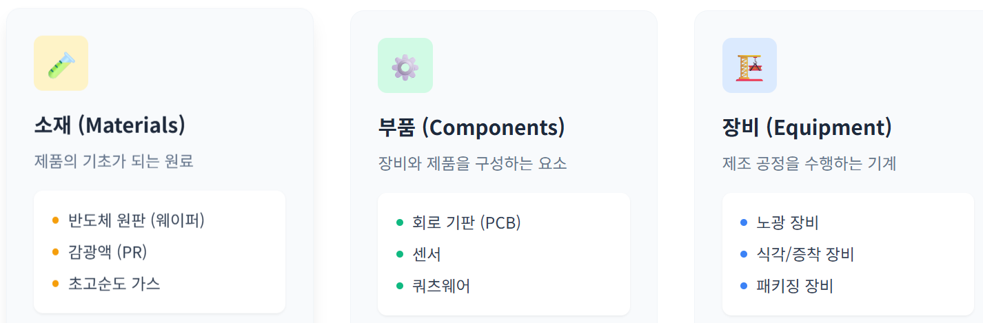- 장비(Equipment): 노광, 식각, 증착, 패키징 등 제조 기계
