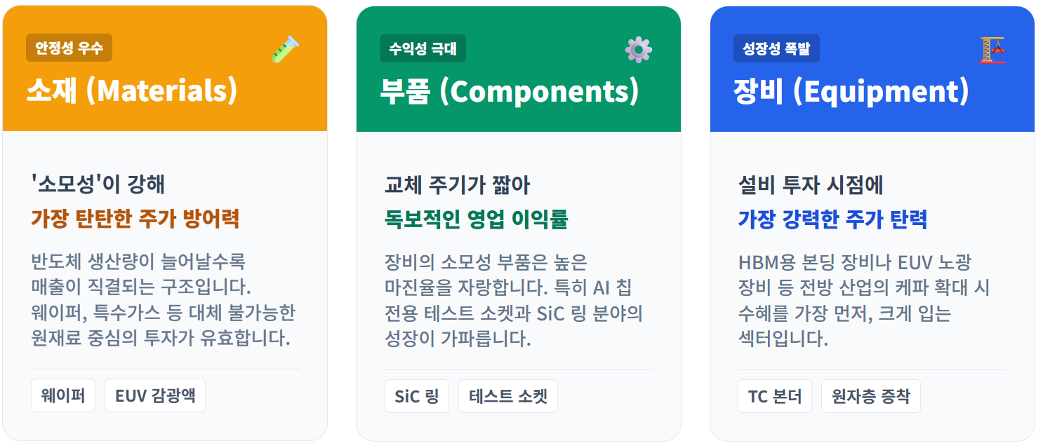 | 소재 | 웨이퍼, 화학소재, 가스 | 반도체의 ‘원재료’ |