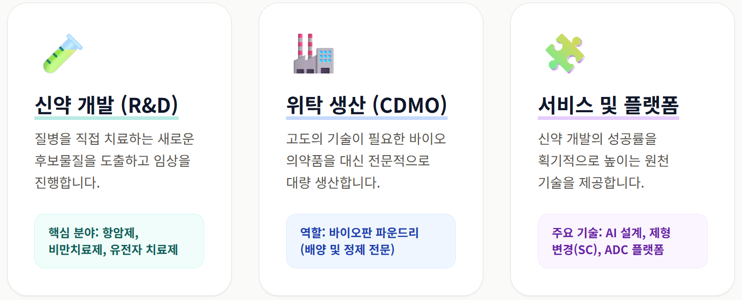 - 위탁 생산(CDMO): 고도의 기술이 필요한 바이오 의약품을 대신 대량 생산 (세포주 개발, 배양, 정제)