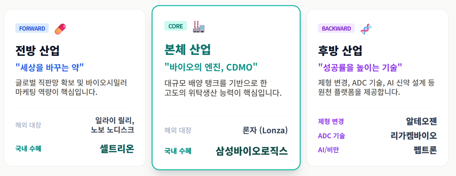 - 본체 산업 (제조 및 생산): "바이오의 엔진, CDMO" - 대규모 배양탱크, 위탁생산 (삼성바이오로직스, 론자)