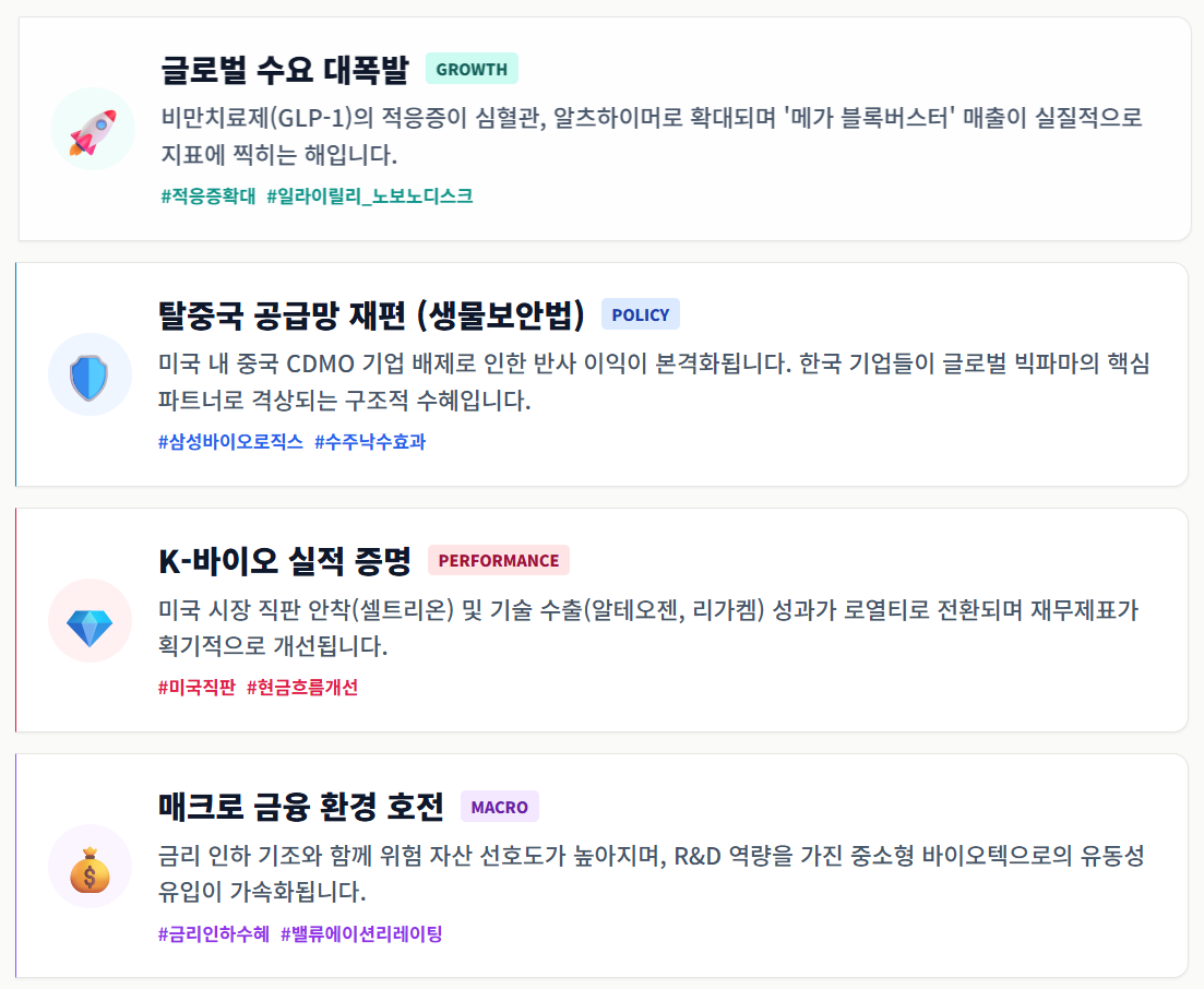 2026년은 바이오가 '기대감'에서 '확정적 실적'으로 전환되는 중요한 시기이기도 합니다.
