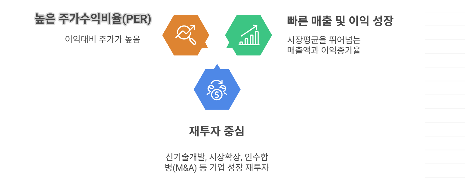 특히, 이러한 기업의 대부분은 R&D(연구개발)에 적극 투자하며,단기 배당보다는 장기 주가 상승에 초점을 둔 비즈니스 모델을 가집니다.